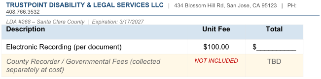 Electronic Recording Fee: $100.00 per document (TrustPoint service fee only). County Recorder fees, city transfer taxes, and all other governmental fees are NOT included and are the sole responsibility of the client.